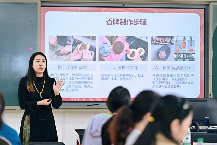 进入实操环节,教职工四人一组、十指生香。调泥时低声讨论比例,压模时相互提醒力度,修边时交流方法,脱模时屏息期待。不多时,莲花、玉兔、云纹、书简等造型别致、香气宜人的香牌跃然掌心,药香与欢笑交织,传统与创意碰撞,现场气氛温馨而热烈。