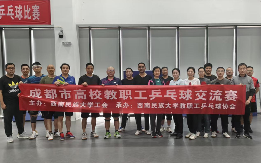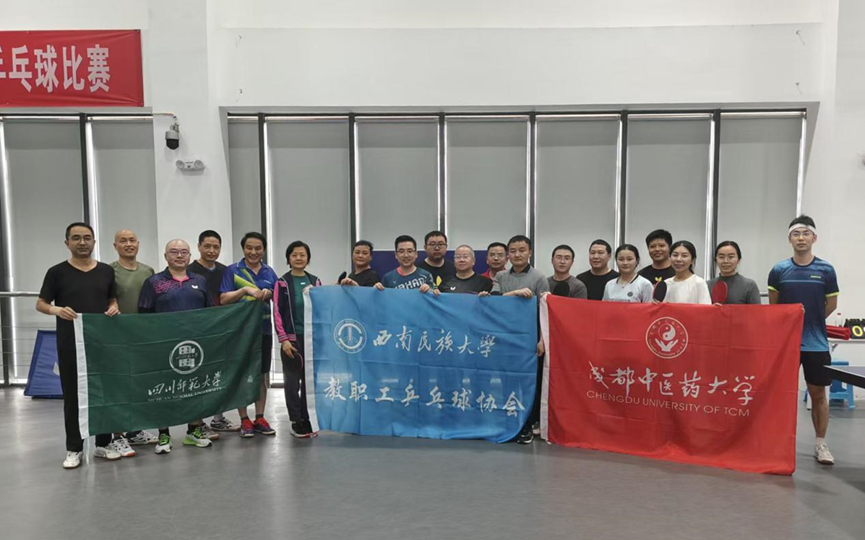 初冬暖阳映球台,三校精英聚一堂。 11月15日下午,我校教职工乒乓球协会应西南民族大学教职工乒乓球协会之邀,参加了成都市高校教职工乒乓球交流赛,参加交流的还有成都中医药大学教职工乒乓球协会。比赛以“友谊第一,比赛第二”为宗旨,三校教职工在球台前挥洒汗水,以球会友,现场气氛热烈而友好,欢声笑语中尽显运动激情。